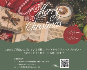 LINEをご登録いただいている皆様にクリスマスプレゼント!対象ドリンクを一杯サービス致します