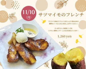 期間限定、ブリュレ仕立てのレアチーズフレンチ サツマイモが11/10(月)から登場!サツマイモ味のアパレイユをたっぷり浸み込ませ濃厚なソースとともにお召し上がりください♪さっぱりとした紅玉リンゴをシナモン風味にソテーしたものを添えています!